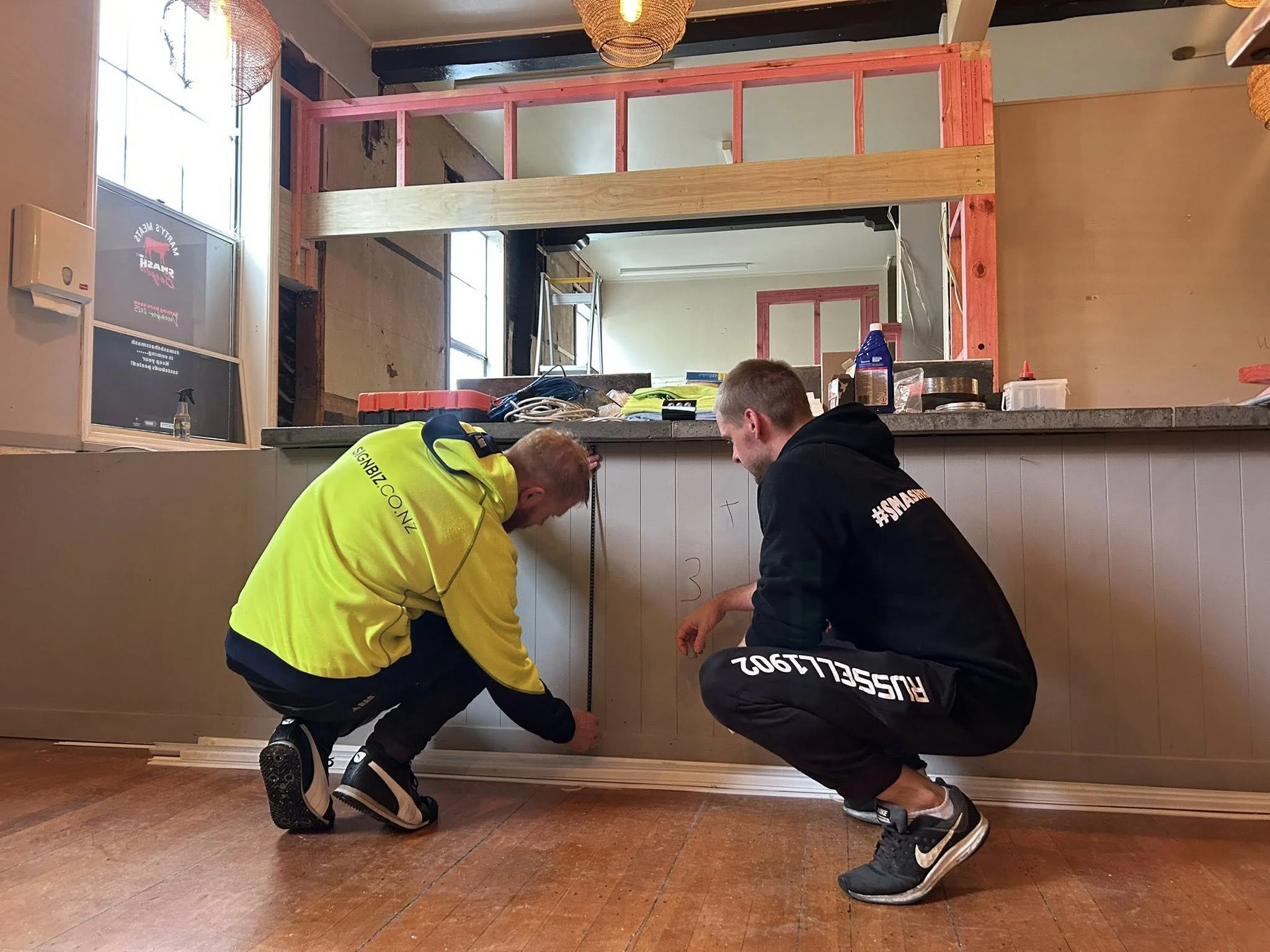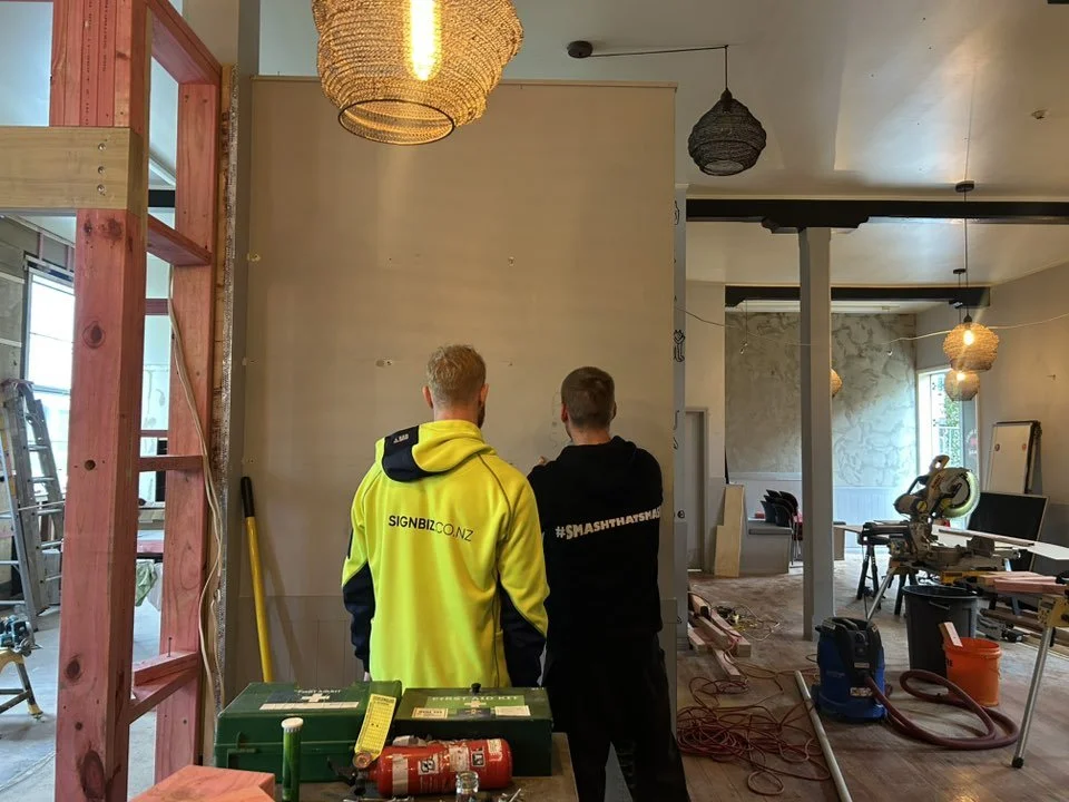 With the build taking shape, Marty and Mikey from Signbiz Tasman are deep in design mode — planning every room, every detail, and every inch of that signature Marty’s Meats vibe.
